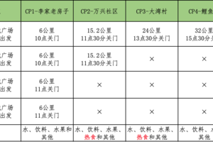 - 补给站CP1-李家老房子于11点关闭,CP2-万兴场将于12点关闭,CP3-大湾村将于14点关闭,CP4-鲤鱼村将于16点关闭,关闭后将不提供服务。