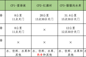 5、补给站CP1-望场坡于11点30分关闭,CP2-红旗村将于14点关闭,CP3-猫猫沟水库将于16点关闭,SPSL-观音泉将于12点关闭,关闭后将不提供服务。。