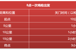 为了保证参赛运动员比赛安全、顺利,比赛期间设关门时间如下。参赛者在规定的关门时间内未跑完对应距离的参赛者须立即停止比赛,退出赛道,以免发生危险。退出比赛者可乘坐组委会提供的摆渡车到相应项目的终点。